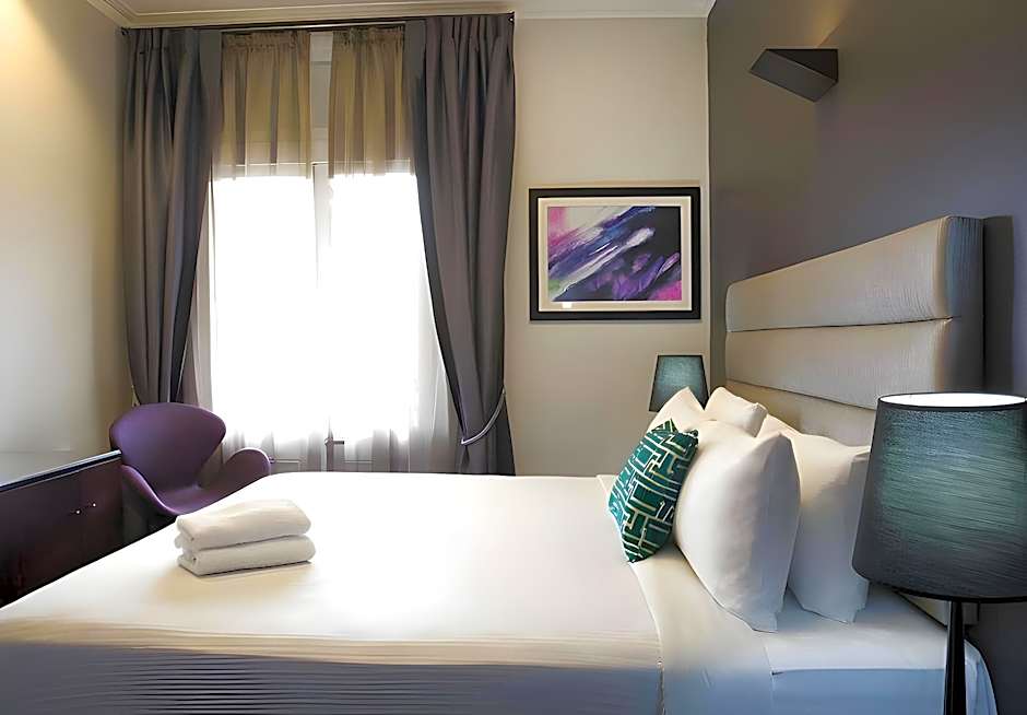 The small double room features a digital LCD TV, a fridge and a small private bathroom.